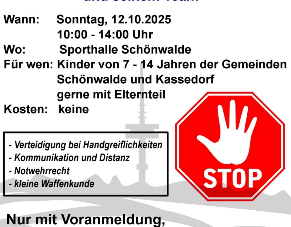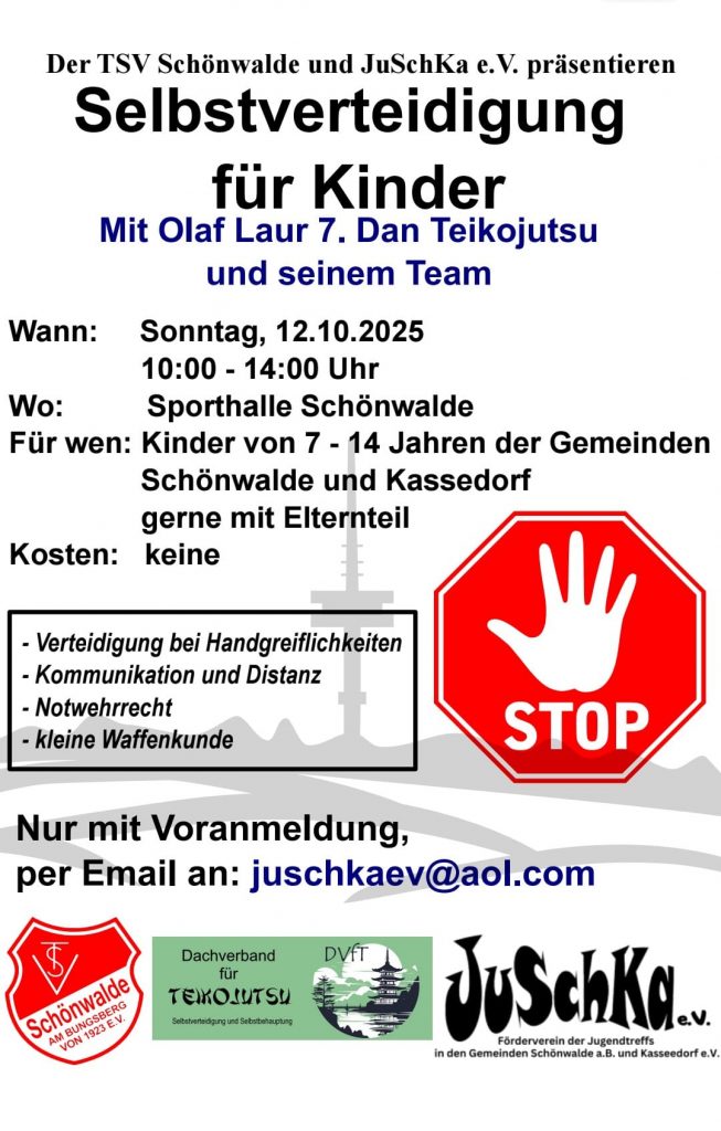 - Der TSV Schönwalde und JuSchKa e.V. präsentieren „Selbstverteidigung für Kinder“ mit Olaf Laur 7. Dan Teikojutsu und seinem Team! Wann: Sonntag, 12.10.2025 10.00 Uhr – 14.00 […]