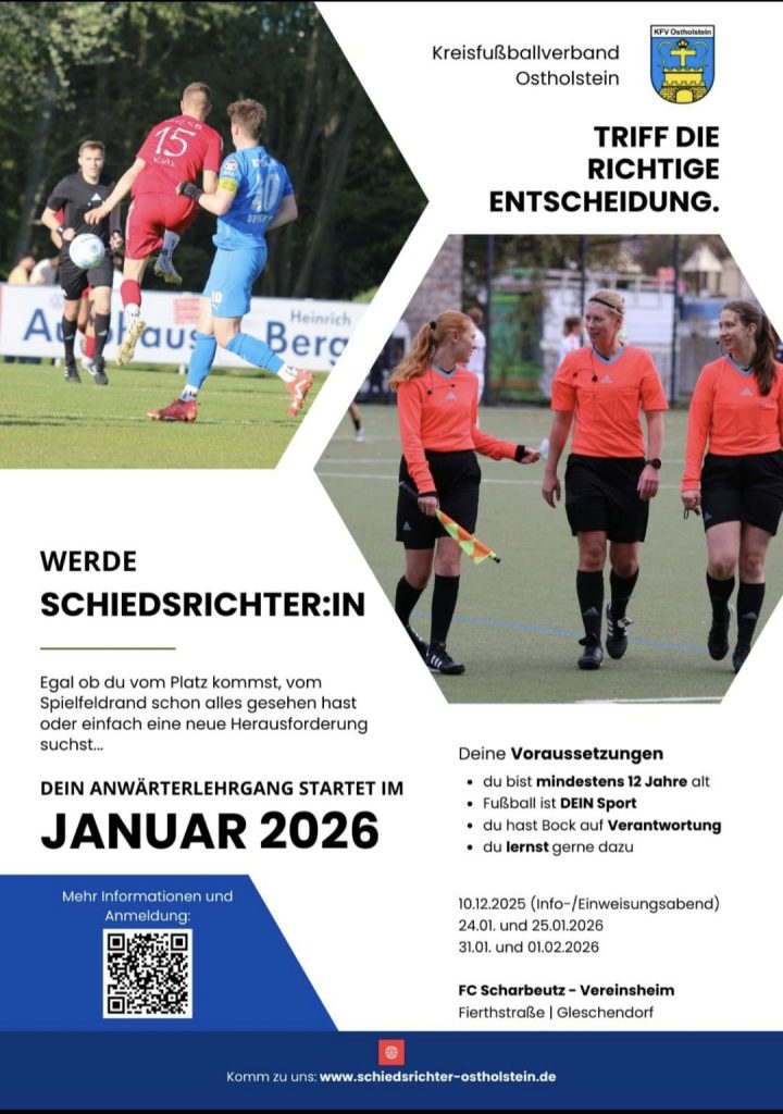 - 🔴⚪ Wir brauchen Schiedsrichter:innen – im Januar 2026 startet der nächste Anwärterlehrgang @schiedsrichter_oh Werde Teil dieser Gemeinschaft – Mehr Informationen auf werde.schiedsrichter-Ostholstein.de 🔴⚪